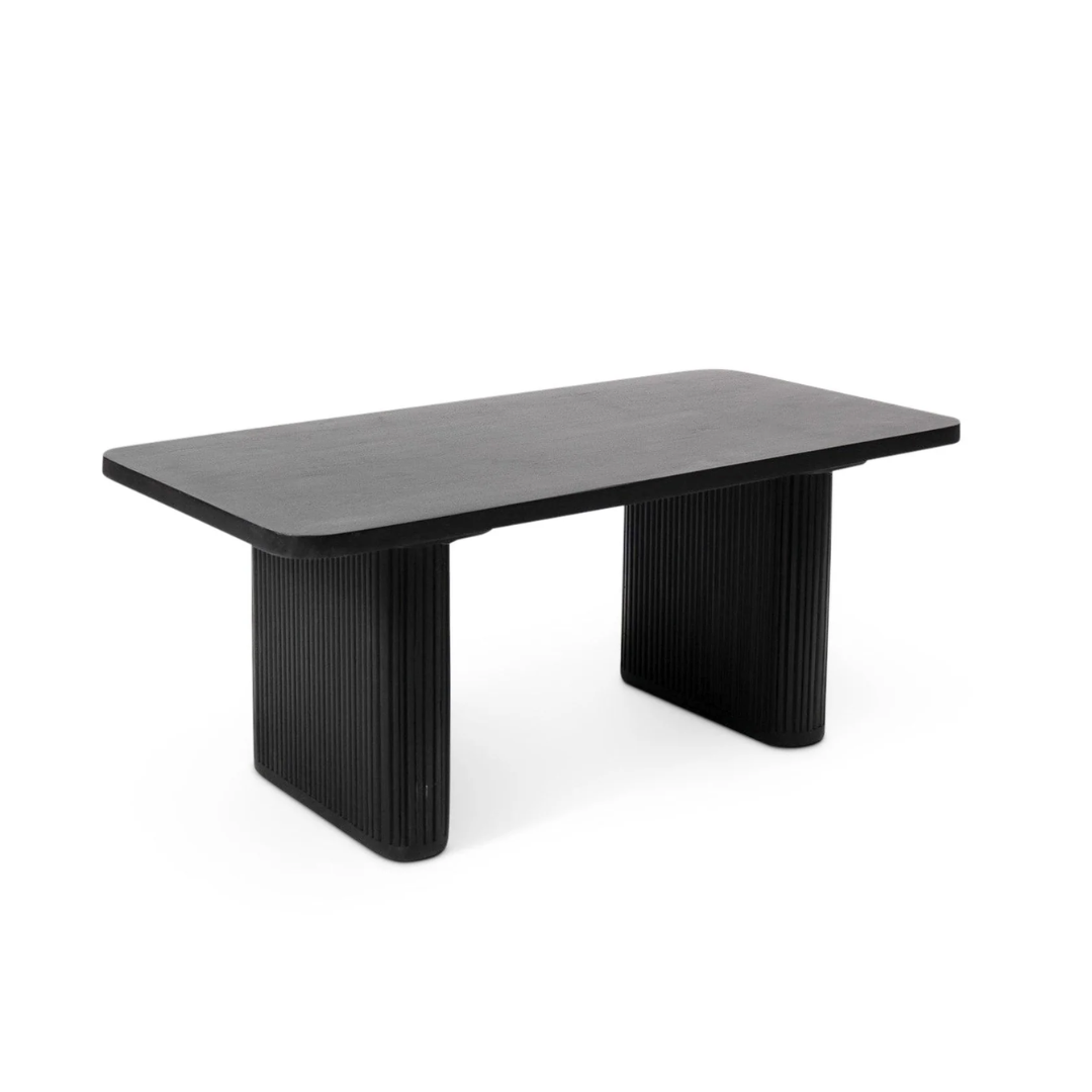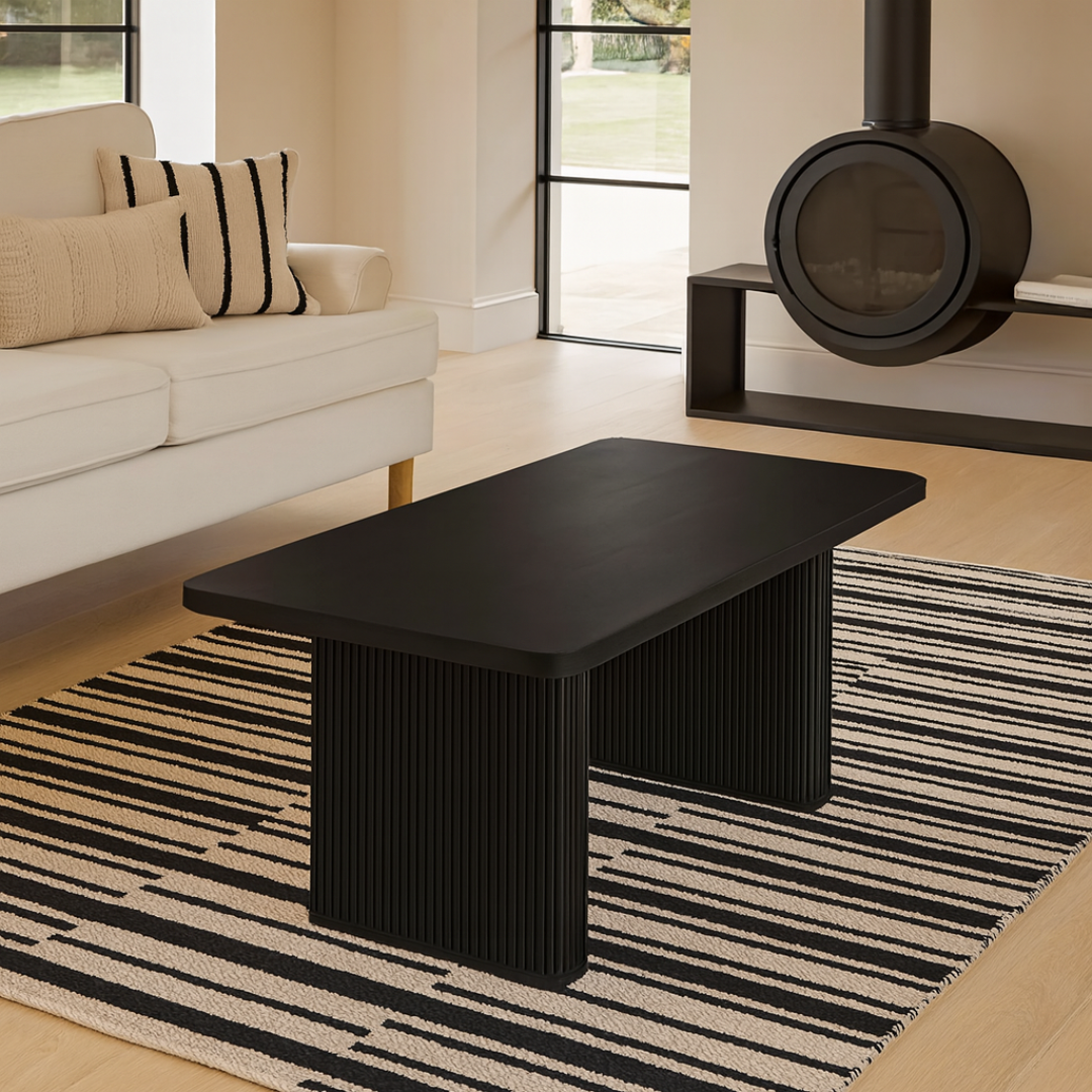 The Black Long Coffee Table makes a bold centerpiece for modern living rooms with its sleek rectangular design and deep matte finish. Built with wide panel legs featuring subtle ribbed detailing, it brings a striking architectural look to any space. Its generous surface provides plenty of room for books, décor, or serving trays, making it both stylish and practical. Perfect for pairing with neutral or monochrome interiors, this table creates a sophisticated focal point.