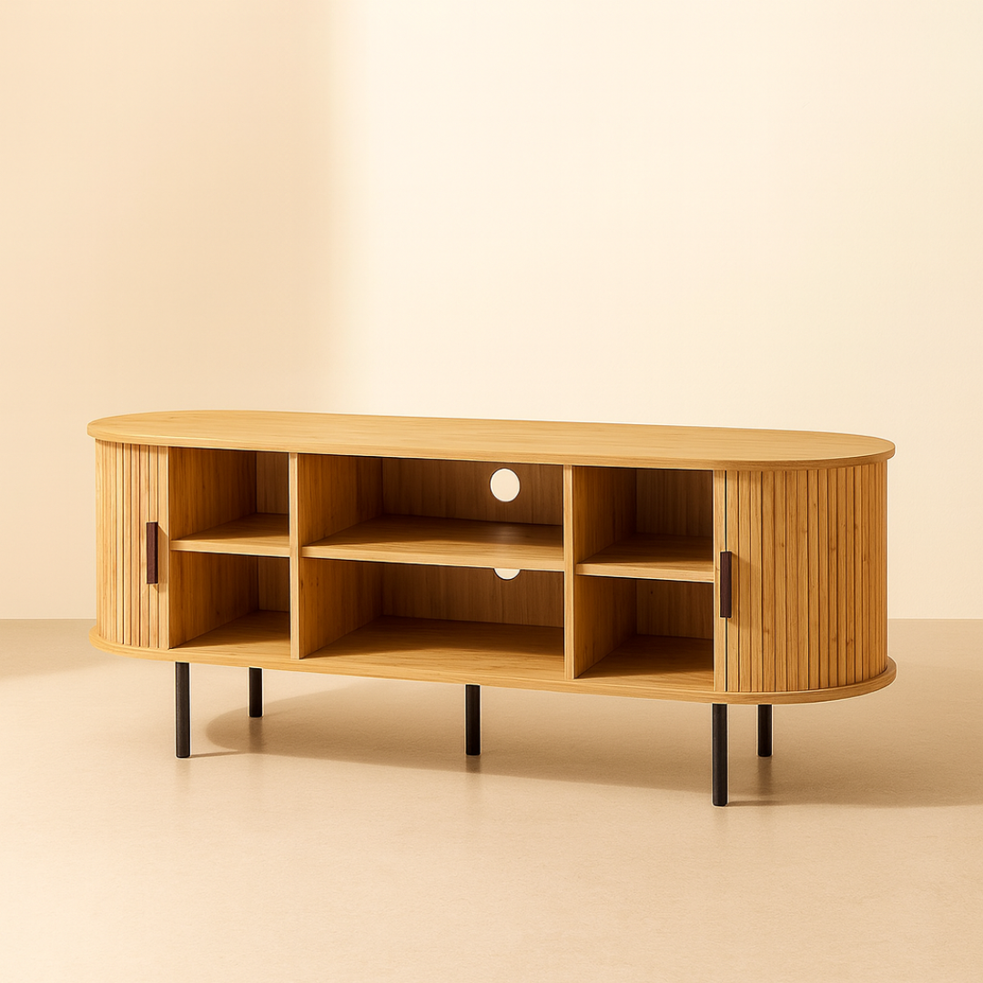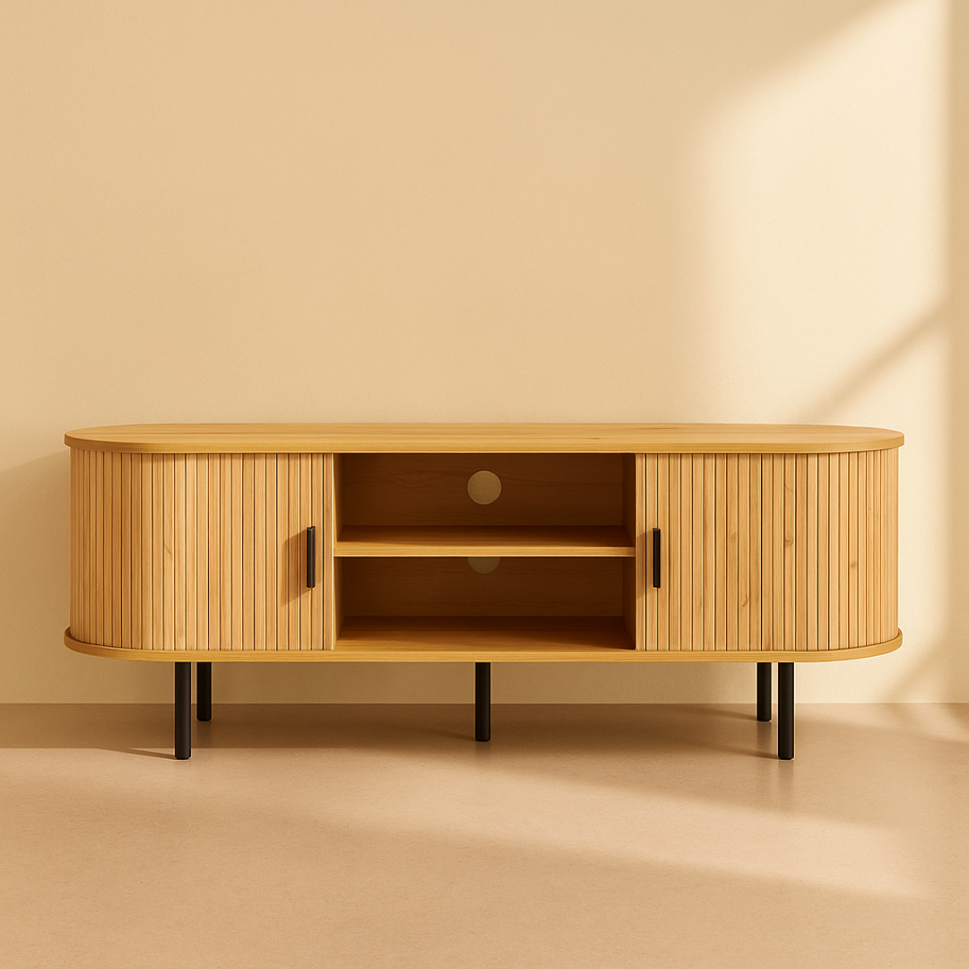 This light oak sideboard with sliding door brings clean lines and soft curves to your space, without giving up on practicality. With two panel-style sliding doors, open centre shelving, and black metal legs, it’s designed to hold your clutter and still look amazing.