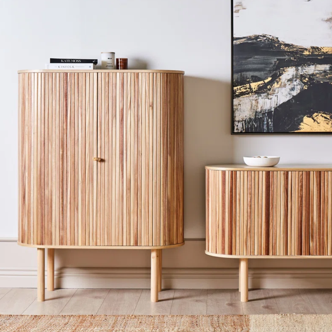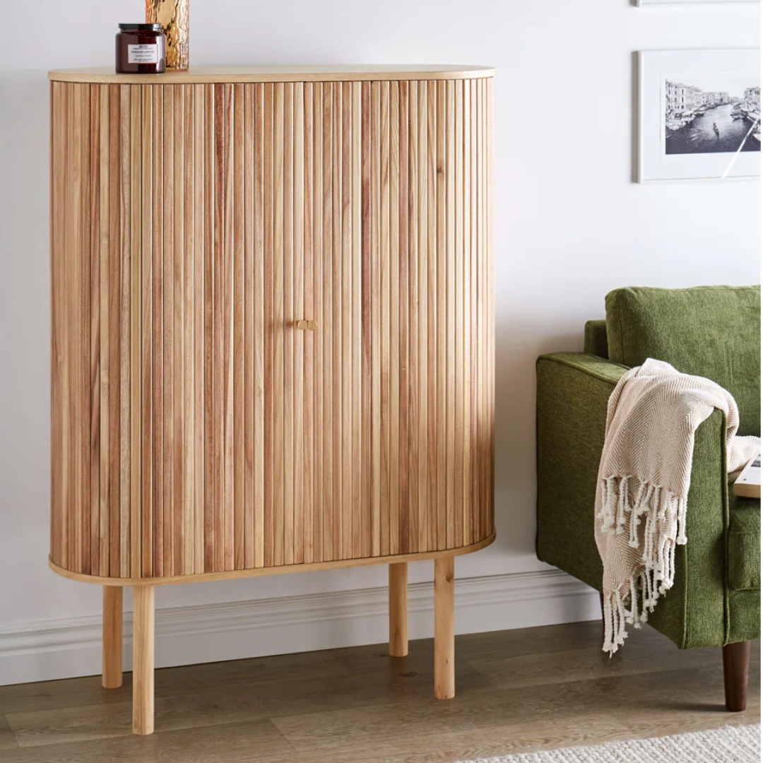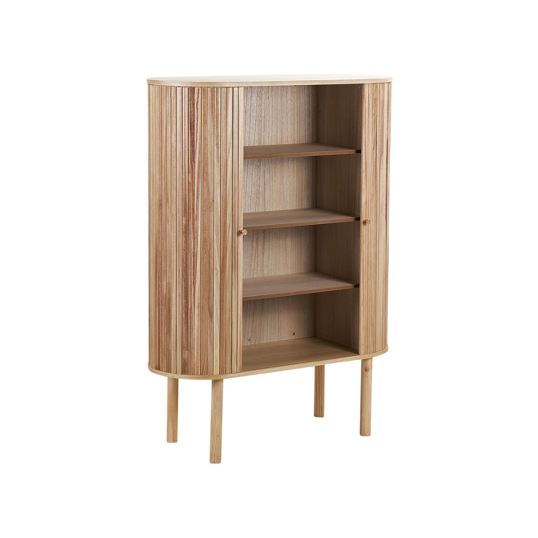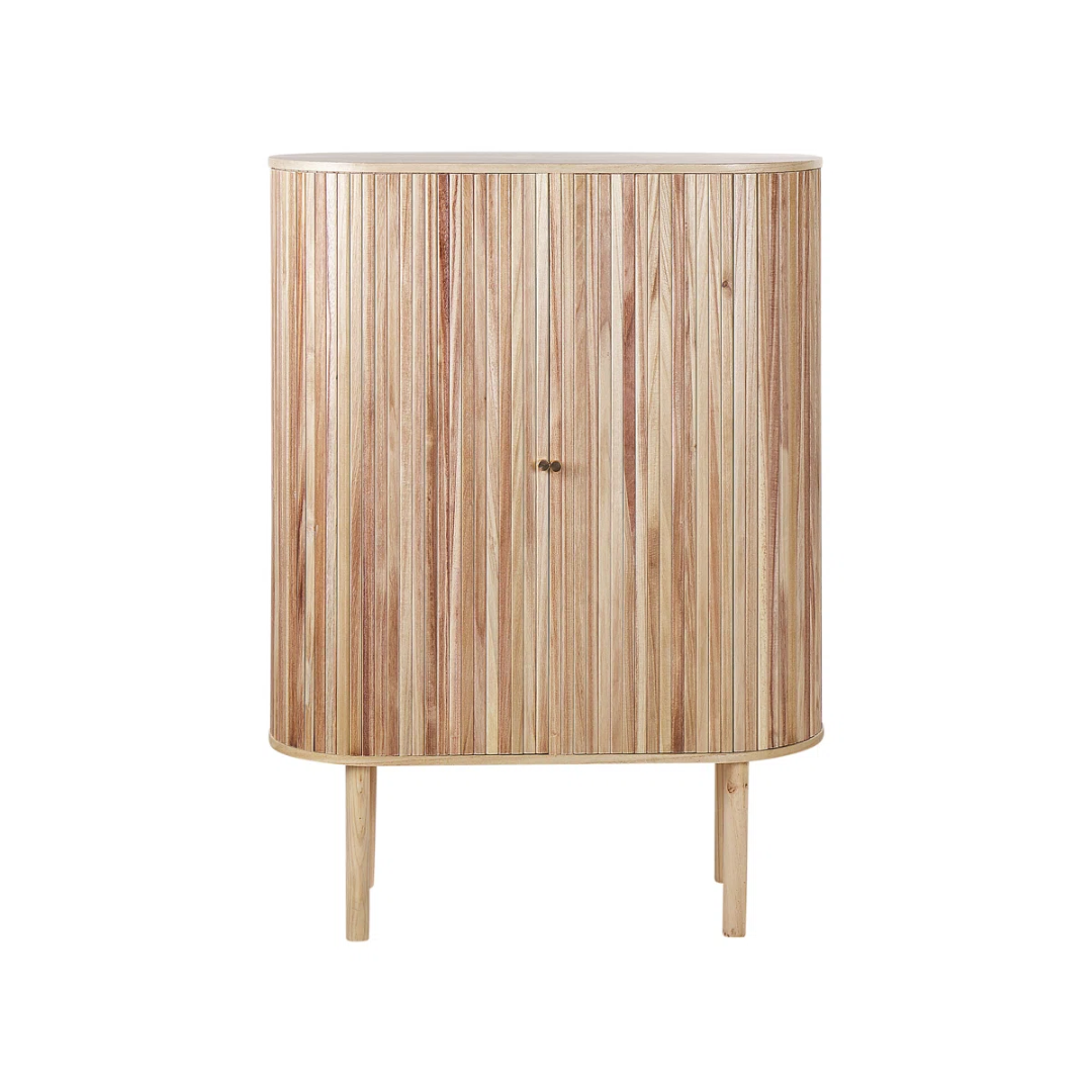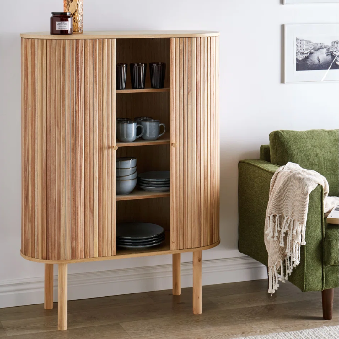 The Light Wood Tall Storage Cabinet With Doors And Shelves is a versatile piece that combines clean design with everyday usefulness. Crafted from light wood with a slatted front finish, its tall silhouette makes the most of vertical space, offering generous shelving for dishes, books, or décor. Two slim doors open to reveal adjustable shelves, giving you the flexibility to organise as you need. Its natural finish makes it ideal for Scandinavian, Japandi, and modern interiors. Place it in a dining room for crockery, a living room for display pieces, or even a hallway for hidden storage that blends seamlessly with your space.