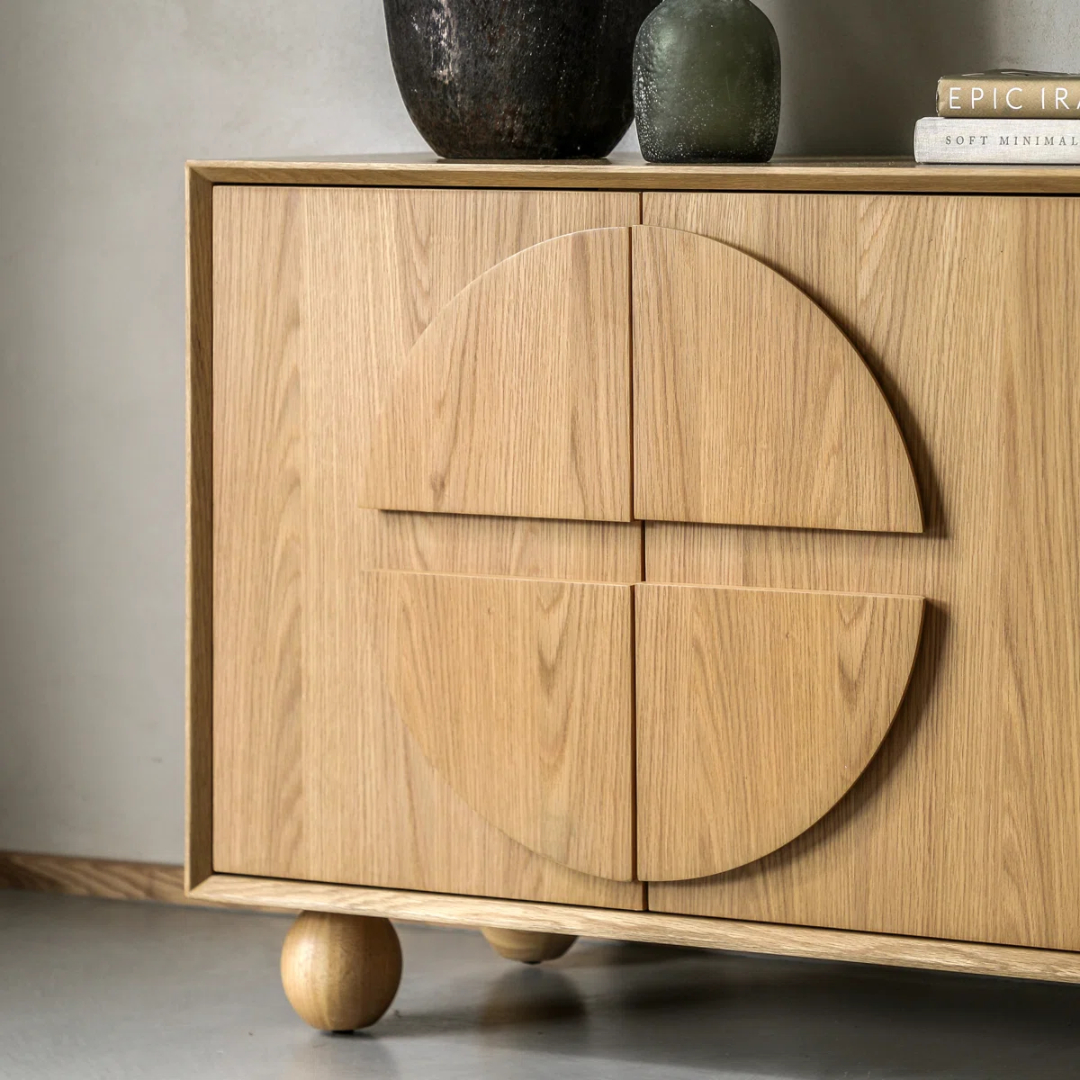 Design Features – Bold circular front panels, ball feet, concealed shelving