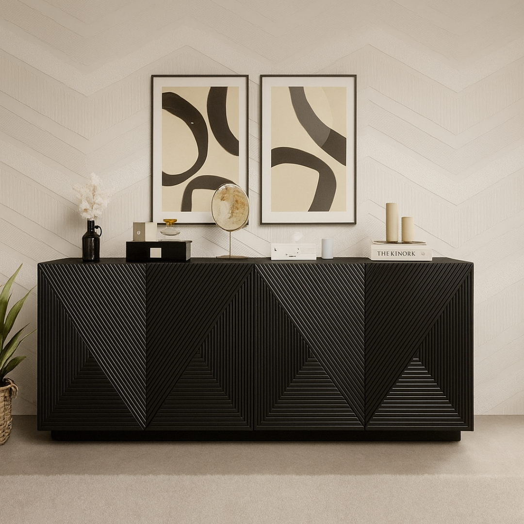 The Modern Black Sideboard Cabinet makes a bold statement with its sharp geometry and deep matte finish. Featuring raised triangular detailing across four push-to-open doors, it delivers striking texture and graphic balance in one clean-lined silhouette.