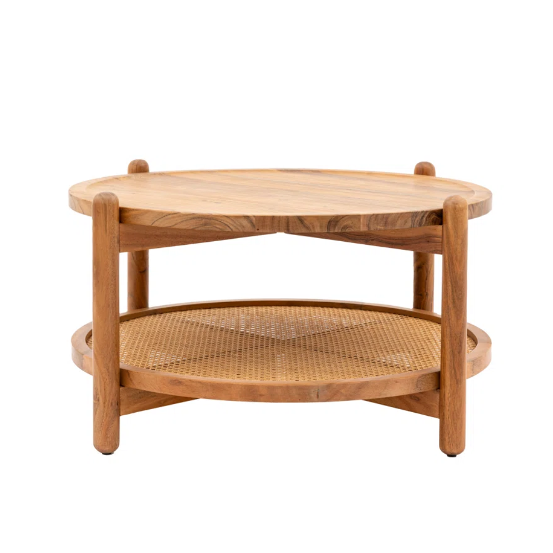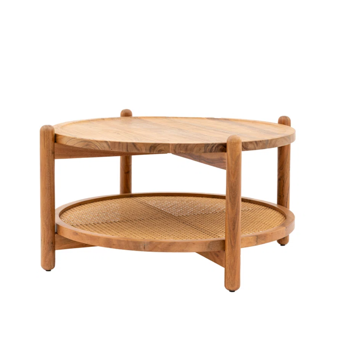This round small storage coffee table brings a natural feel and clever design to your living space. The top tier features a lightly grained wood finish, while the lower shelf—crafted from woven cane—adds texture and hidden utility. Whether you’re stacking books, remotes, or your favorite candle tray, it keeps your space looking sharp without sacrificing storage.